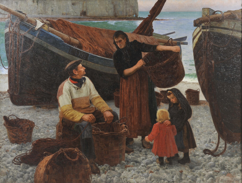 《ノルマンディーの浜》は鹿子木孟郎(かのこぎたけしろう、1874~1941)が2度目のフランス留学中の1907(明治40)年に制作されました。本作は1908年春のフランス芸術家協会サロンに入選し、帰国後の第2回文部省美術展覧会にも出品されるなど、留学の総決算として描かれた鹿子木の代表作です。